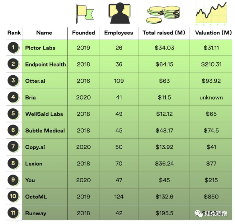 以此为出发点,Lightspeed 筛选了拥有至少 10 名员工并且已经获得某些外部融资的公司,最终,推动 AI 技术应用于实际场景的“明日之星”,有 11 个名字值得关注,它们分别是: