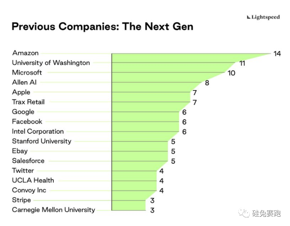 梳理“八强”公司的人才背景,Lightspeed 还发现,他们的最大的共同点就是,其技术人才的教育背景主要来自许多知名学府(不出所料),如下图所示: