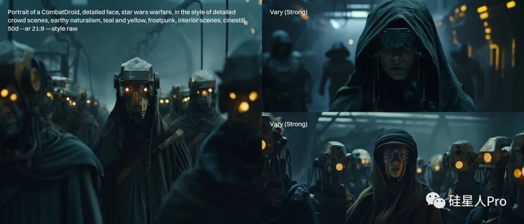 使用 "Strong Variations "功能也很有帮助。这使得创建多样化场景变得容易,同时还能保持前一个变体的色调。女战士的场景可以转变为普通市民、网络黑客或战斗场景,而无需生成新的提示。