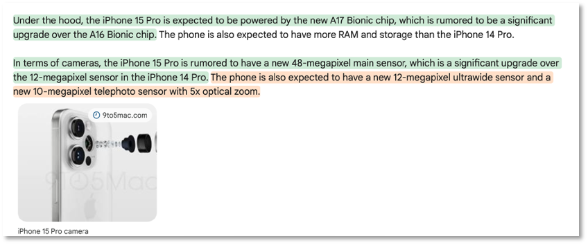 对话机器人一直最被人诟病的是胡说八道,现在,Bard 试图缝补这个漏洞,与搜索引擎结合后推出了核实功能,点击“G”可让 Bard 自查有没有犯错,让对话机器人做到“知错就改”。更先进一点的是,Bard 会自行标出哪些内容可信度高,哪些内容与搜索到的内容相悖,并附上来源链接。