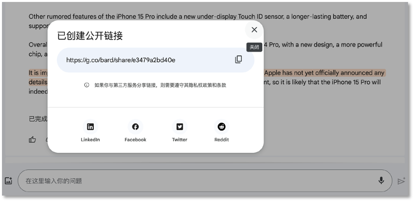 假如你是一名科技圈的写手,你可以让 Bard 撰写一份 iPhone15 测评,现在,它能做到一键保存至谷歌文档,供你润色修改。如果你觉得内容太过主观,你还可以分享当前的对话链接至 Linkedin、Facebook、Twitter、Reddit 四个社交平台,邀请他人参与对话讨论,且对话停止一段时候后,讨论仍可以接上文继续。