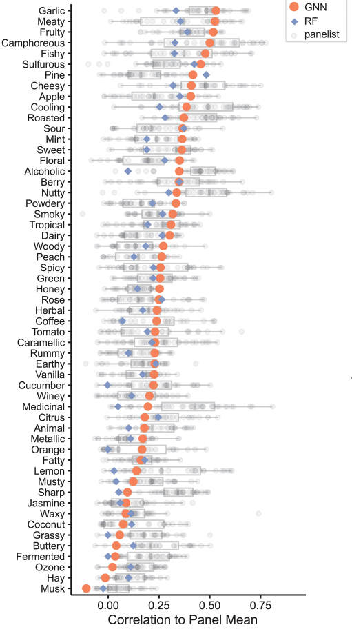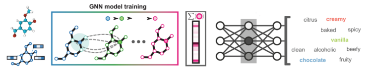 研究人员结合了 Good Scents and Leffingwell & Associates(GS-LF)香精香料数据库,建立了一个包含约 5000 个分子的参考数据集作为训练基础素材,每个分子可以有多个气味标签,比如果味、花香、芝士味和薄荷味等等。