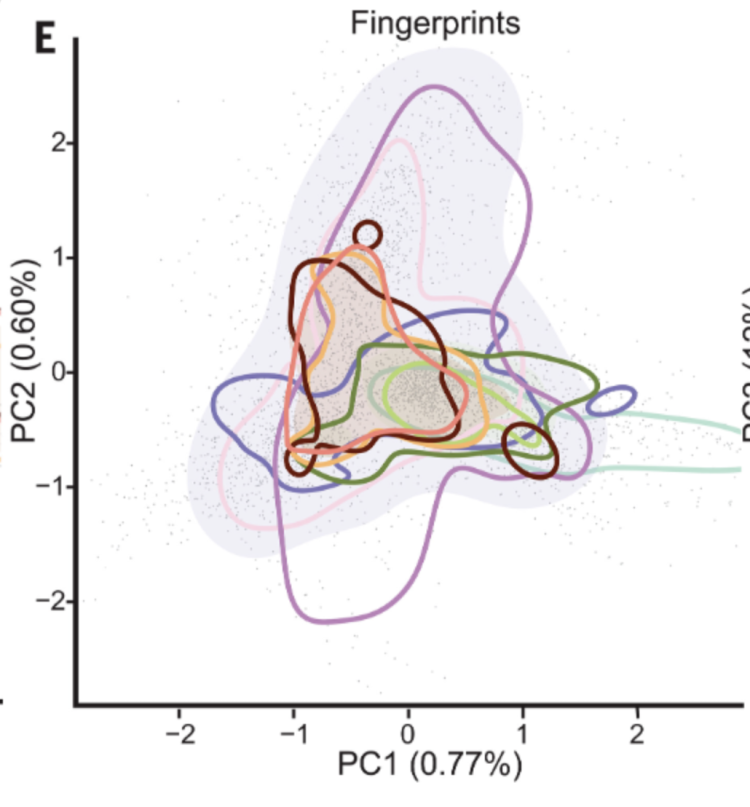 你可以把上文那个表示气味感知距离的坐标图理解成是这张图的无限放大版。论文提到,这张图中包含了约 50 万种气味分子,当中甚至有许多还没有被发现或合成出来(但确实能计算出来)。