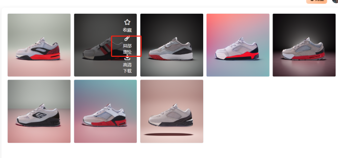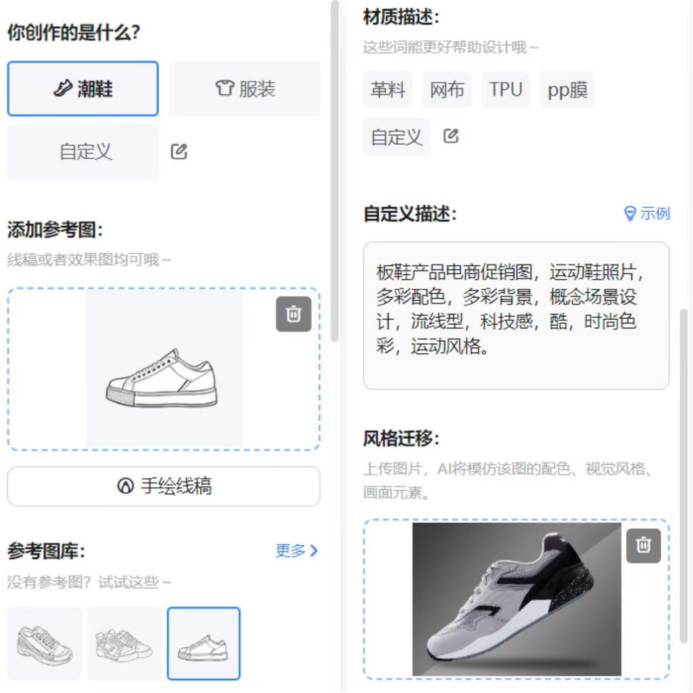 用“AI 鞋服”工具可以完成初步的商品图,选择线稿参考图、材质、文字描述后,一次性能生成8张图片,生成结果也能二次微调。
