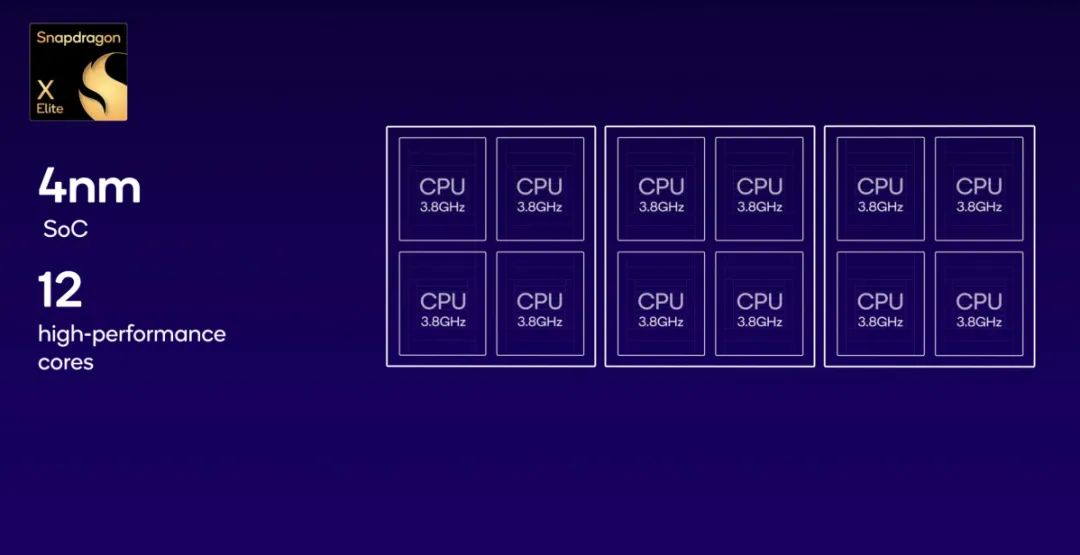 另一方面,作为一款 4nm 芯片,骁龙 X Elite 也使用了全新的架构设计,配备 12 个 3.8GHz 高性能核心,采用三丛集设计。