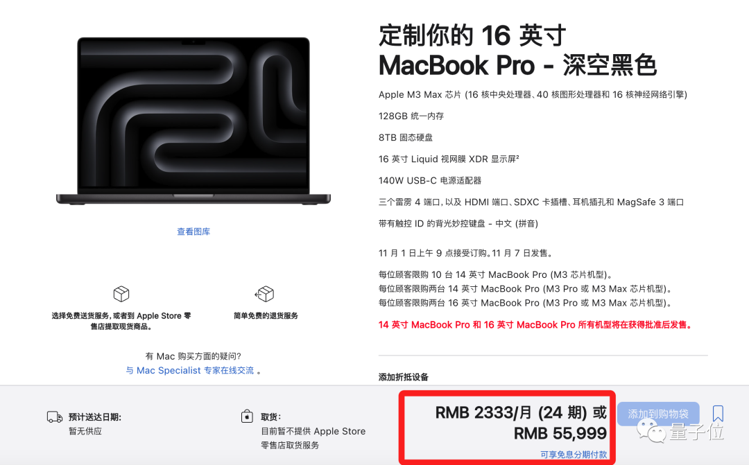 国内市场价已出,正如我们最开始提到的,搭载 M3 芯片的 MacBook Pro 起售价为 12999 元;而搭载 M3 Max 的最高配 MacBook Pro,价格则高达 55999 元。