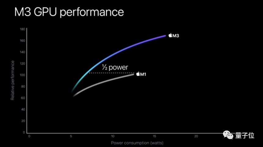 功耗也有所降低。M3 GPU 在提供相同性能下,功耗几乎只有 M1 的一半。
