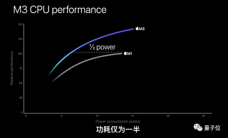 与此同时,功耗也有所降低。M3 CPU 在与 M1 提供相同性能,功耗几乎只有之前的一半。