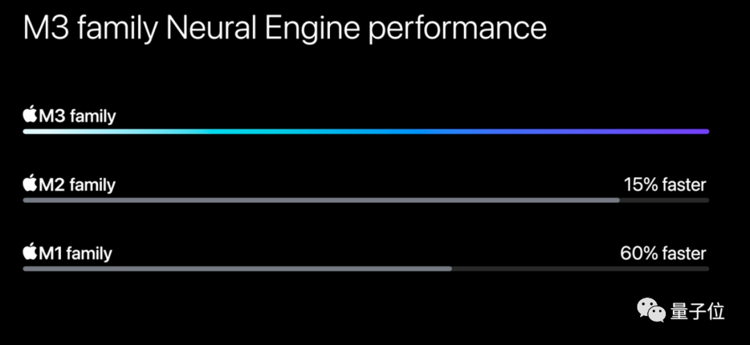 除了 CPU 和 GPU 以外,两大引擎也有所更新。其中,M3 神经网络引擎性能相比 M2 提速 15%,相比 M1 提速 60%。