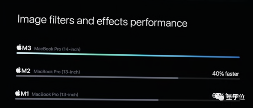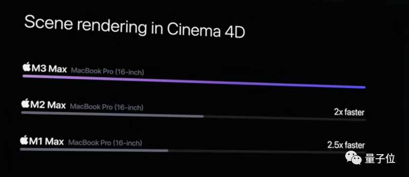苹果和自家芯片做了个对比,结果显示 M3 系列比 M2 提升 1.8 倍,比 M1 性能提升 2.5 倍。