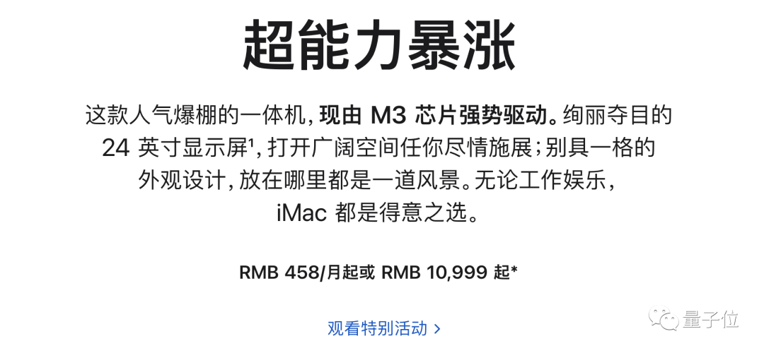 价格方面,根据目前苹果中国官网显示,搭载 M3 芯片的最新 iMac 起售价为 10999 元;最高配(加上配件等),价格达到了 22598 元。