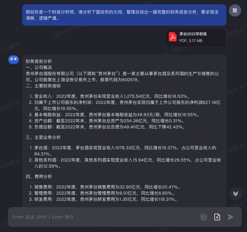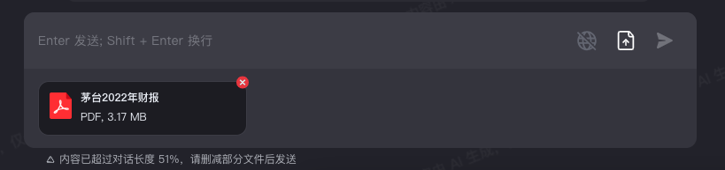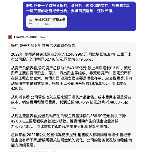 考虑到实际工作中报告动不动就上百页,我们继续提提难度,让 Claude 和 KimiChat 一起分析下贵州茅台 2022 年 127 页的财务报告。