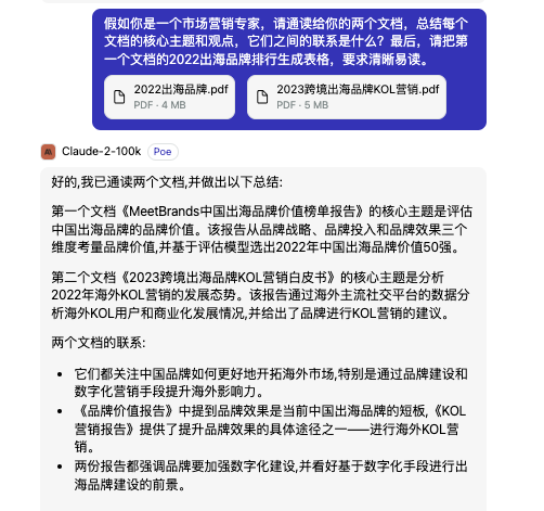 整个体验非常丝滑,Claude2 和 KimiChat 很快总结好了两份文档的核心主题,对比原报告内容都没有太大出入。