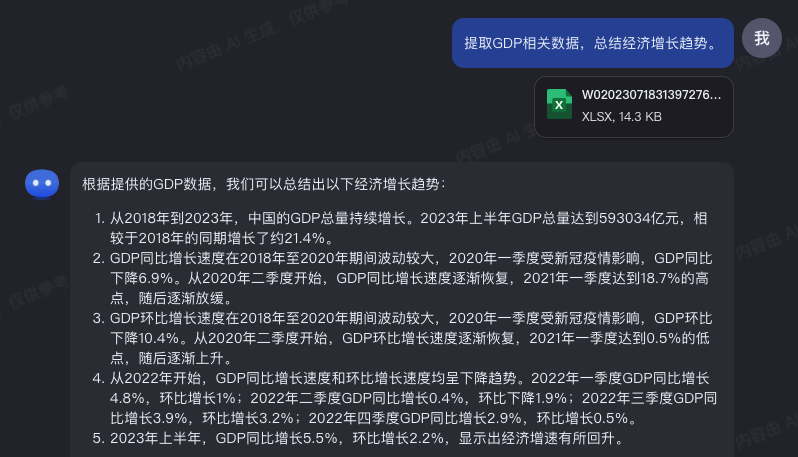 除了上传数量限制外,Claude2 支持的格式丰富度也不及 KimiChat。例如,在 KimiChat 中,你还可以把 Excel 表格拖进对话框,让它提取相关数据,做数据分析。