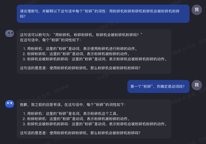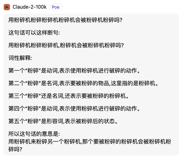 但 Claude2 和 KimiChat 对每个“粉碎”的词性分析都不完整,且回答有错误。