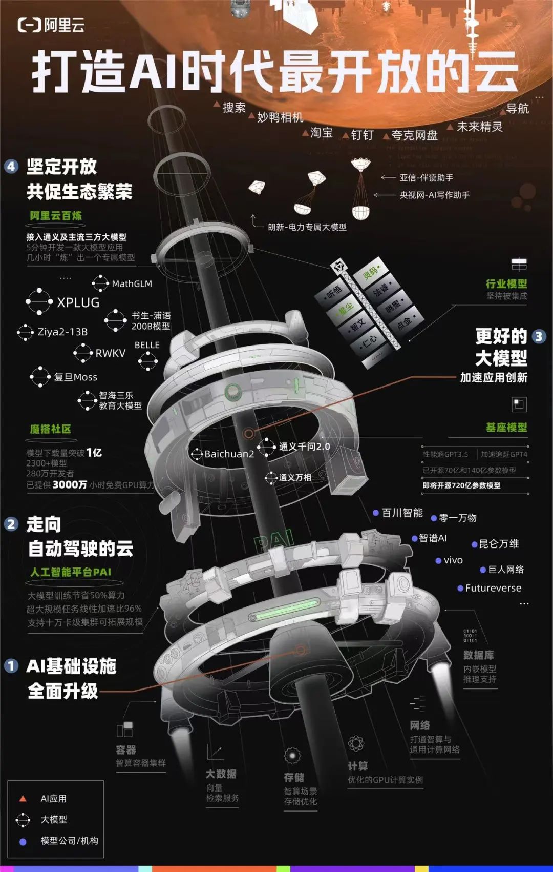 AI 大模型是过去一年来科技领域最显性的创新之一。百模大战之中,阿里云要做一朵“AI 时代的云”,阿里巴巴要作为科技平台支撑更多创新,“只有站在更先进、更稳定的技术能力之上,才有更大的开放底气。”