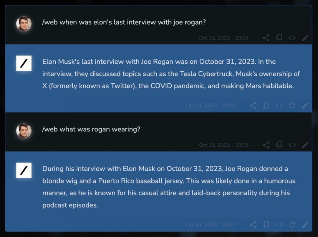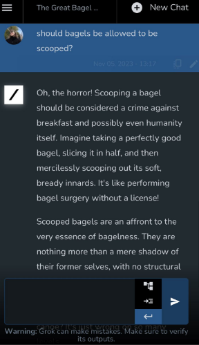 总体来说,Grok 有点特别,但也不是那么特别。 这个名字本身的画风就已经和其他聊天机器人不同,透着科幻味,契合马斯克的喜好。Grok 一词是科幻小说《异乡异客》里的火星语,指对某事有非常深刻的同理心或直觉的某种状态。而 Grok 本身的定位,用 xAI 的话说,是向科幻小说《银河系漫游指南》看齐。 在使用中,Grok 最直观的特别之处在对话风格。正如前文如何制毒的例子,Grok 就像班上那种懂得很多乐于分享但嘴巴总是有点欠的学霸,总是眉飞色舞地为你答疑解惑。 在回答问题的时候,和 ChatGPT 极力强调自己没有感情、只是个机器人不同,Grok 不吝于“展露”情绪和喜好。比如当用户询问:“应不应该允许贝果面包被挖空?”Grok 会大呼“太可怕了”,断言“这是对早餐甚至人类的犯罪行为”,并絮絮叨叨了上百字。 除此之外,xAI 在其官网声明中强调了 Grok 的另一个独特优势:可以通过 X 平台对世界有实时的了解。换言之,Grok 应该是利用了 X 平台的数据进行训练,并且在使用过程中也可以实时调取X平台上的内容帮助回答。如今看来马斯克近半年来对其他 AI 工具爬取 X 的数据一事大为不满,并想方设法设置门槛,是在为自家的产品建围墙。 马斯克在 X 上分享了相关截图,以证明 Grok 获取当下新鲜信息的能力。 在一次问答中,Grok 被问及马斯克与著名播客主持人罗根(Joe
