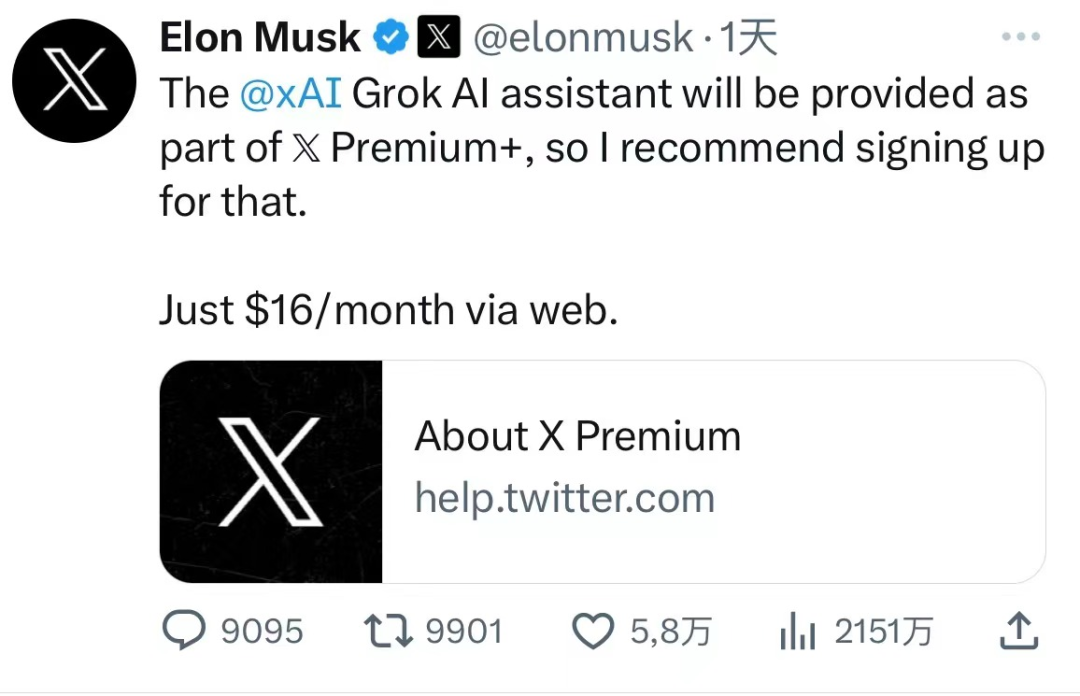Grok 只是个开始,而目前的 Grok 更是“尝鲜粗糙版”,马斯克和 xAI 已经准备好深入。 在 xAI 官网的声明中,多次呼吁更多人才加入。接下来,xAI 还将在一些方向上精进,比如模型上下文理解和检索的能力,以及为 Grok 配备视觉和听觉等不同感官能力,提高多式联运能力,实现包括实时交互和协助在内的更广泛的用途。 目前的 Grok 仅为初期测试,开放给少量美国用户,其他感兴趣的用户可以通过xAI申请。 马斯克已经为 Grok 准备好了“大串联”,一方面是和 X 平台本身的联系,这里不仅是 Grok 训练数据的重要来源,还将是 Grok 的主舞台。马斯克发贴称,一旦通过 Beta 测试,Grok 将对 X 平台高级订阅用户(X Premium+)开放。 几乎是亲自下场销售订阅服务,马斯克呼吁“我推荐购买,网页端仅需 16 美元/每月”。 自去年收购 X(彼时还叫推特)以来,马斯克裁员、关闭数据中心以节省开支,给品牌改名改 Logo,向“超级应用”转型。但平台的盈利能力始终未见提升。 就在 10 月底,X 被曝出公司估值已经降至 190 亿美元,相较马斯克收购时提出的 440 亿美元已经腰斩。付费订阅服务,是马斯克接手这家社交媒体后简单但有效的一种赚钱手段,将 Grok 内嵌于最高一档的订阅服务中,很可能抱有刺激订阅用户增长的期待。 此外,特斯拉也有可能和 Grok 互哺。马斯克在 X 上点赞了“Grok 较低精度的量化版本可以利用本地计算在特斯拉上原生运行”相关内容,并称“只要我们的车载人工智能计算机能够运行模型,特斯拉就可能拥有地球上数量最大的真正可用的推理计算能力。” 自动驾驶系统被称为“AI 项目之母”,特斯拉在这条路上开发了 Dojo 超级计算机,已于今年 7 月投产。10 月,又有消息称特斯拉正在美国德州奥斯汀总部建设大型建筑,以容纳 Dojo 的一部分。目前尚不清楚 xAI 模型训练是否借用了特斯拉的资源,但今后由 Dojo 提供算力、X 和特斯拉提供训练数据、xAI 做模型研发,就能形成有机共同体。