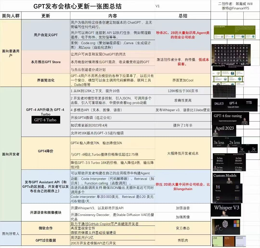 除了最引人注目的工具箱 all tools 和 Agent,OpenAI 还升级了 GPT4 的六大能力,包括 128k 长文本、全新的 Assistants API 以及视觉 CV 在内的多模态功能。这些围绕着模型层的能力让 OpenAI 在市场是具有了更强的竞争力,也让创业者们一直垂涎多模态能力走到台前。