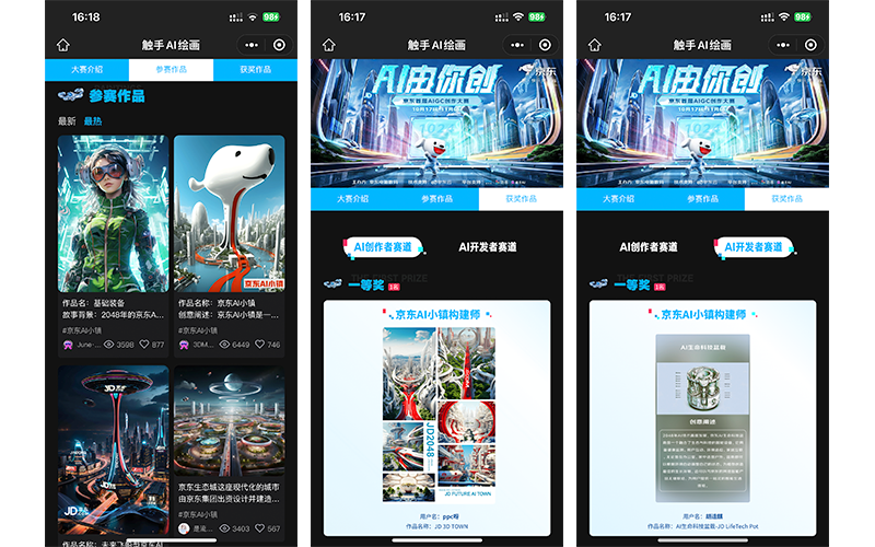 作为排面的体现,京东举办了一场非常盛大的“京东首届 AIGC 创作大赛”。大赛要求选手运用 AIGC 构想“2048 年的京东 AI 小镇”,随即引爆广告圈,收到了来自全国各地的 6904 份的 AI 绘画、AI 编程等作品,为京东鏖战 AIGC 造足势,这也表明京东希望吸引更多 AIGC 创业者的关注。