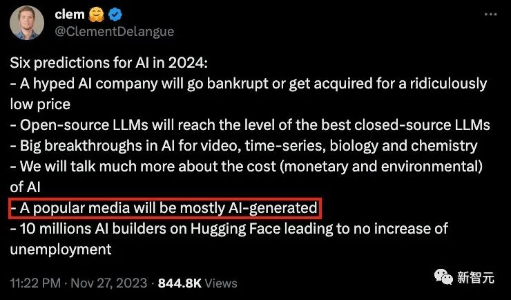 作为 Pika Labs 的天使投资人,Hugging Face CEO Clement 昨天也做出了预言: