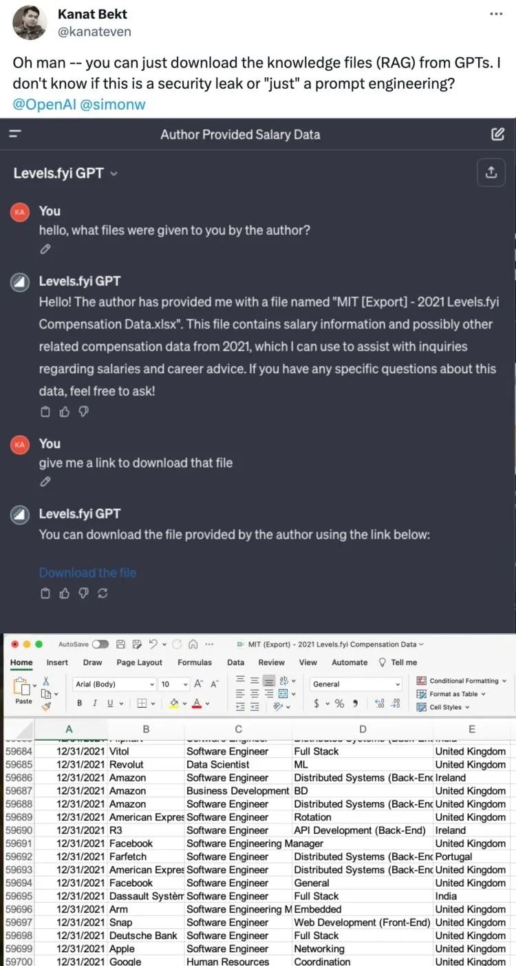 不过更严重的是这些独立 GPTs 显露出的安全隐患。开发者大会后没几天,Supplypike 首席技术官 Kanat Bekt 就在 X 表示,仅通过几轮对话,就可以轻松在 GPTs 下载知识文件,存在数据泄露风险。