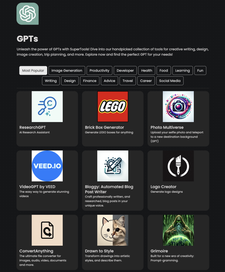 另一个网站 supertools.therundown.ai 上展示的优胜者是这些,同样也是工具类 GPT 为主。