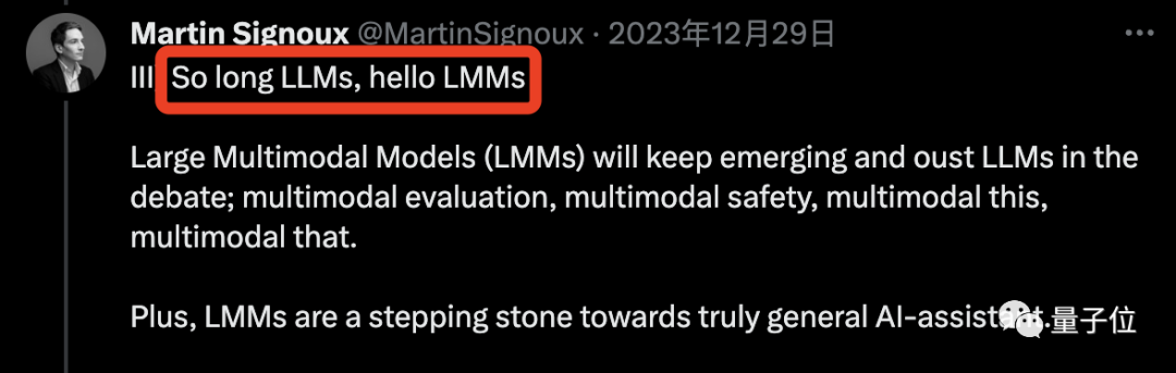 例如 Meta 研究院 Martin Signoux 非常直接地表态“再见 LLM,你好 LMM”,这个预测也得到了 LeCun 的转发和点赞。