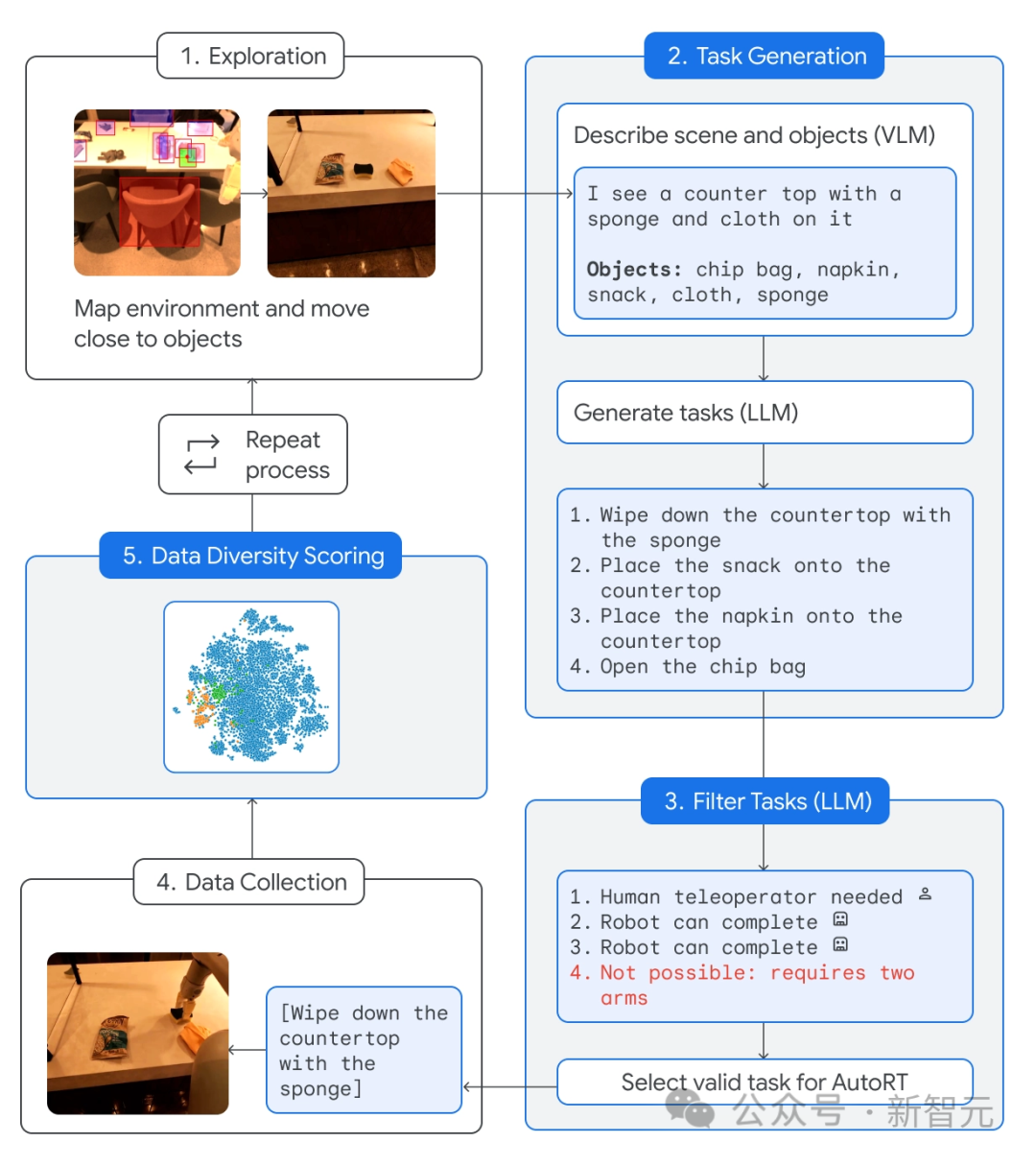 (1)自主轮式机器人发现有多个对象的位置。(2)VLM向LLM描述场景和对象。(3)LLM建议机器人执行不同的操作任务,并在做出选择之前决定机器人可以在没有辅助的情况下完成哪些任务,哪些任务需要人类远程控制,哪些任务不可能完成。(4)尝试所选任务,收集经验数据,并对数据的多样性/新颖性进行评分。以此往复。