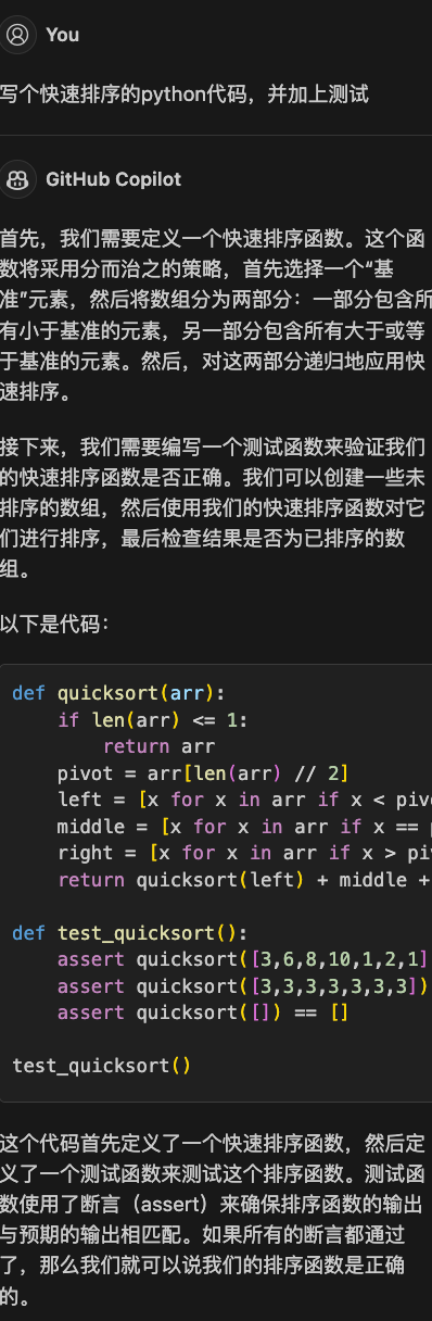 相比之下,Github Copilot 的回复更加清晰,当然也欢迎读者朋友亲自评审下 Copilot 的效果是否正确。