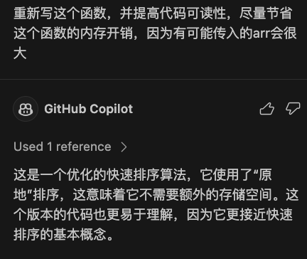 Github Copilot 也有个其他贴心的功能是每次生成代码之后,会有相关问题推荐的功能,例如对当前生成的代码可以有一些新的性能优化建议等。