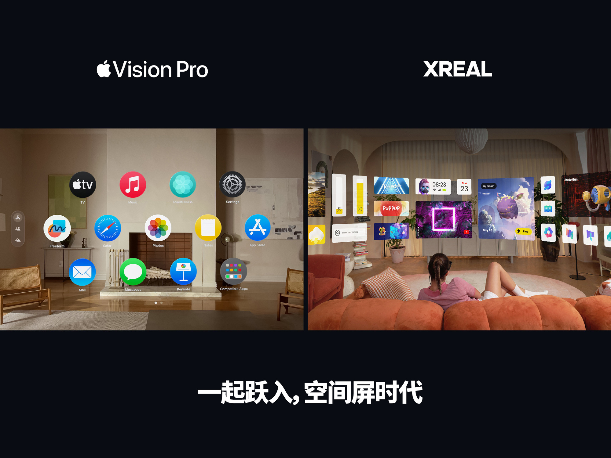 Vision Pro 讲 spatial computing(空间计算),其实在某种程度上,你会发现它交互界面上展示的三个场景,和 XREAL 最主要的应用场景是一致的。