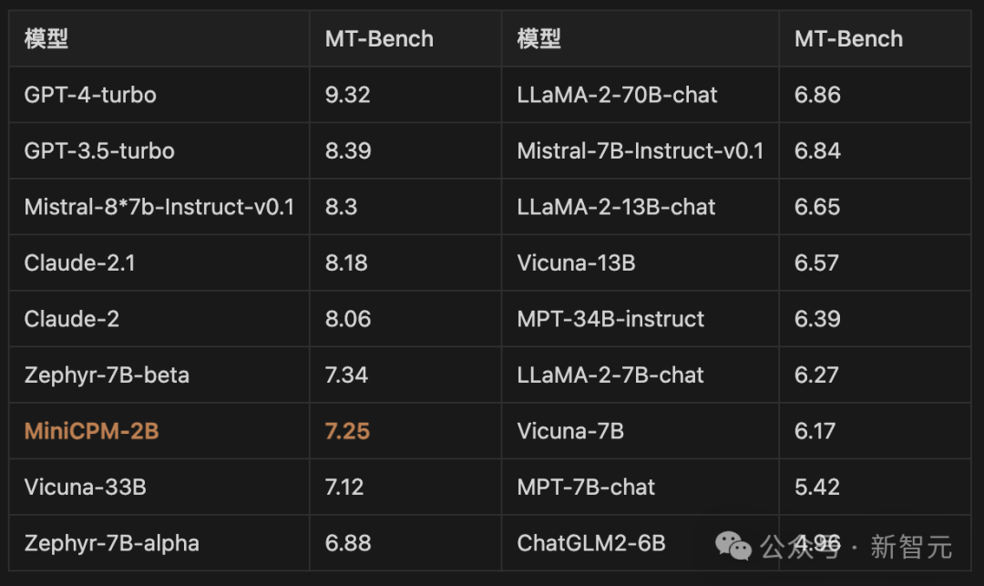 此外,在最接近用户体感的 MT-Bentch 上,MiniCPM 也取得了很好的成绩。