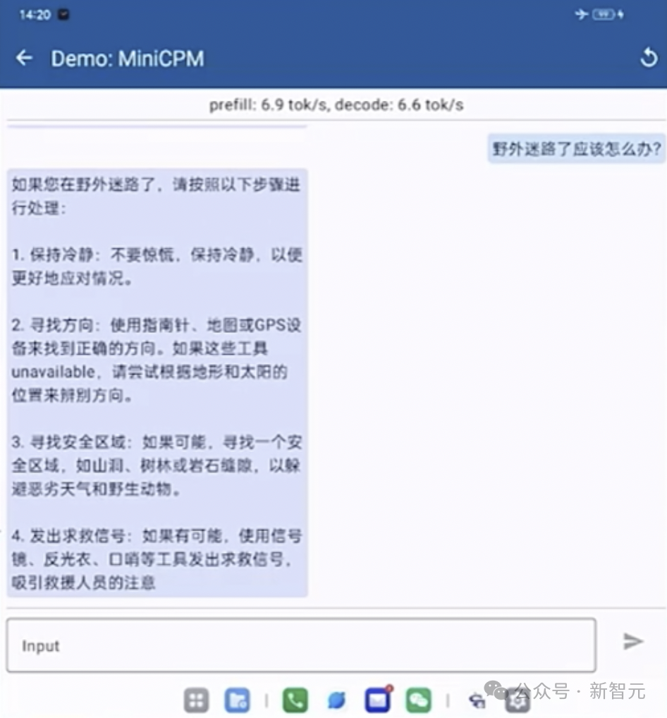 首先把手机调飞行模式,然后向 MiniCPM 求助:野外迷路了怎么办?
