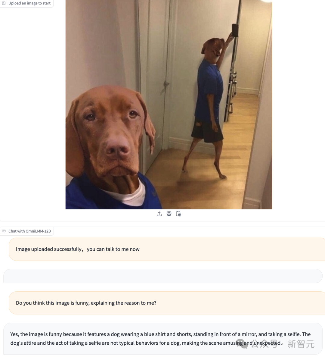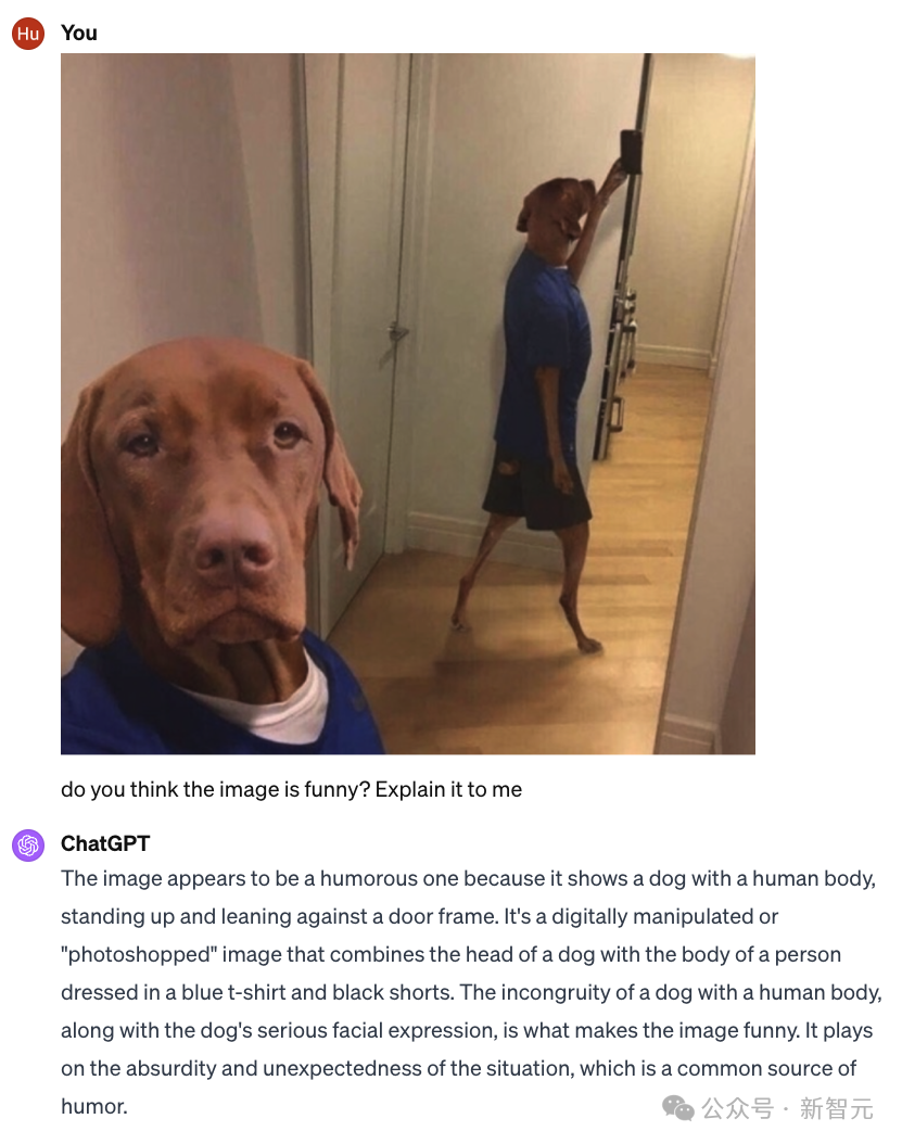 而 GPT-4V 的解释,似乎有些牵强,讲的是狗的表情很严肃,而人和狗的结合很搞笑,没有强调出狗会自拍这个元素。