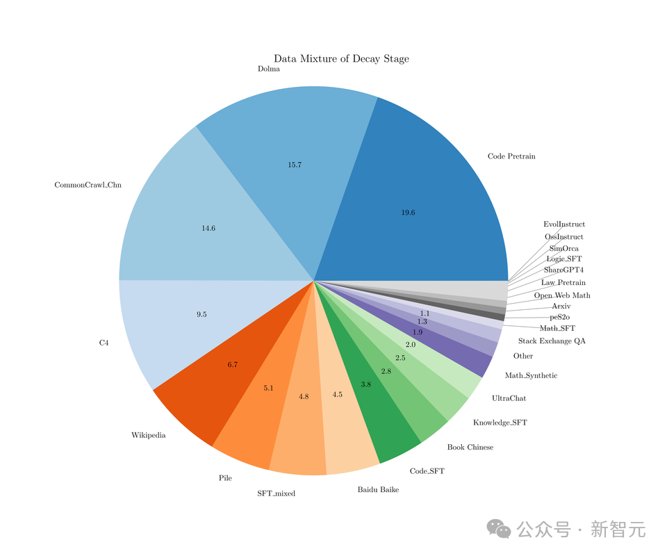 在此阶段,使用 1T 的去重后的数据,其中大部分数据从开源数据中收集来,比例如下图。