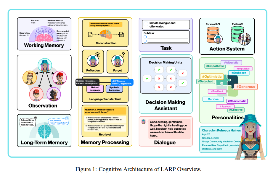 国内创业公司 MiAO 近期则提出了一种名为 LARP(Language Agent for Role Play)的开放世界游戏角色扮演智能体框架。LARP 的重点是将开放世界游戏与语言智能体相融合,利用模块化方法进行记忆处理、决策以及从互动中不断学习。