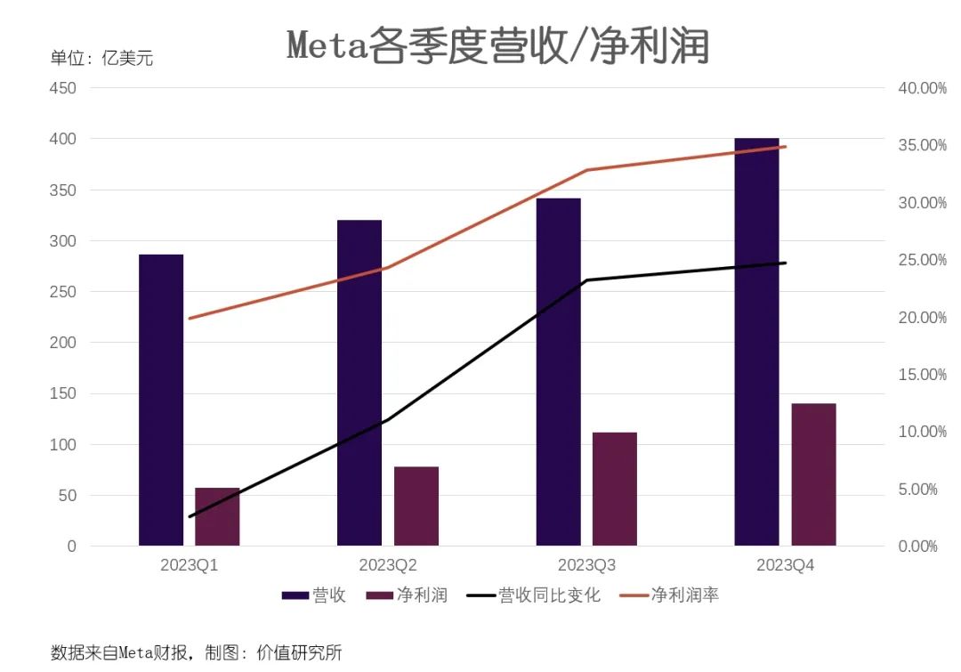 财报显示,Meta 去年四个季度的净利润分别录得 57.1 亿、77.9 亿、112.1 亿和 140.2 亿,对应的净利率分别录得 19.9%、24.3%、32.8% 和 34.9%,后面三个季度全面超过市场预期。除了净利润之外,每股收益、毛利率等指标也得到明显改善,企业的经营已经重回正轨。