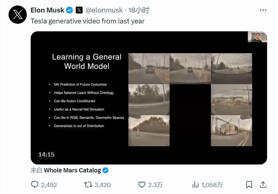 随后他在 X 上转发了一条 2023 年的视频,内容是特斯拉自动驾驶总监 Ashok Elluswamy 向外界介绍特斯拉如何用 AI 模拟真实世界驾驶。视频中,AI 同时生成了七个不同角度的驾驶视频,同时只需要输入「直行」或者「变道」这样的指令,就能让这七路视频同步变化。