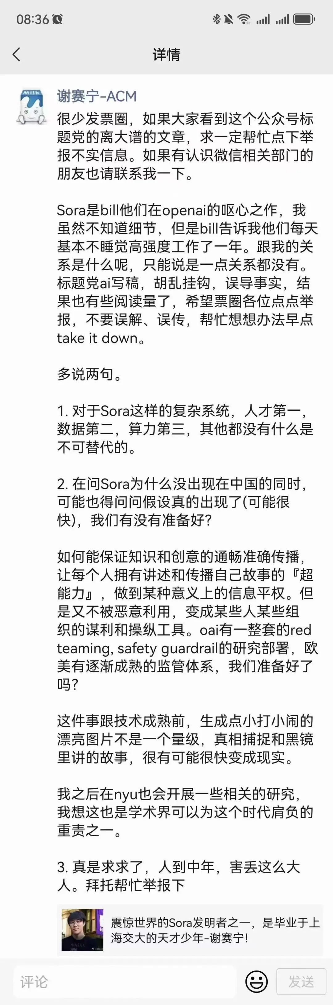 今天,上海交大校友、目前在纽约大学担任助教的谢赛宁在朋友圈辟谣了自己是 Sora 作者之一的消息。他表示,Sora 是 Bill 他们在 OpenAI 的呕心沥血之作,虽然不知道细节,但他们每天基本不睡觉高强度工作了一年。