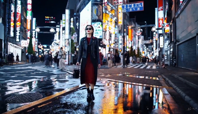 一位时尚女性走在充满温暖霓虹灯和动画城市标牌的东京街道上。她穿着黑色皮夹克、红色长裙和黑色靴子,拎着黑色钱包;她戴着太阳镜,涂着红色口红;她走路自信又随意……