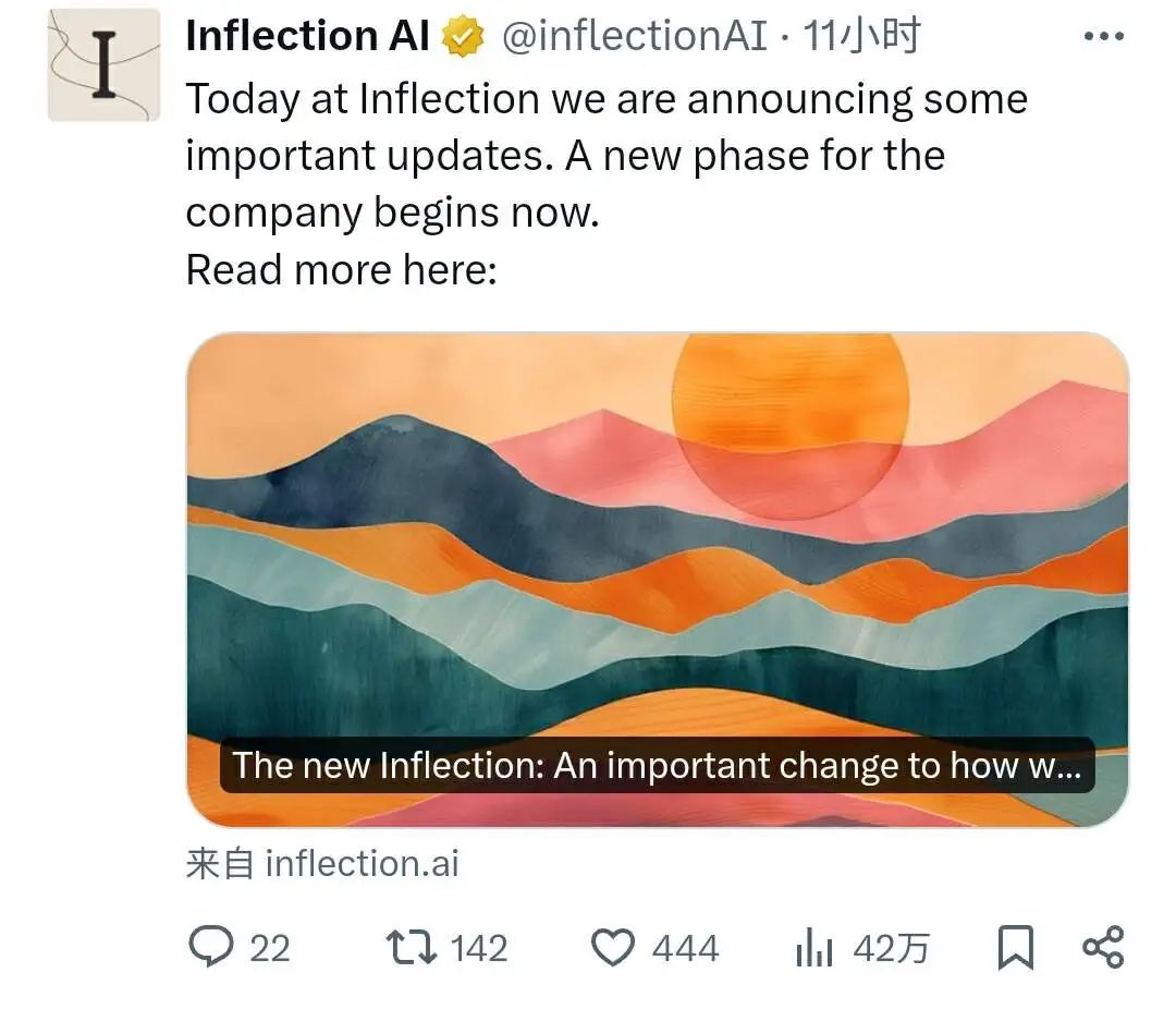这家公司正是去年如日中天被人看好的 Inflection,就在去年 6 月,该公司刚刚对外融资达到 13 亿美元。