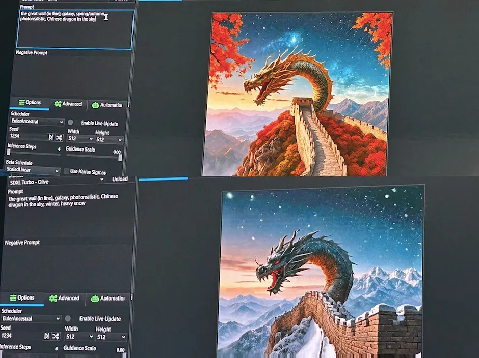 在 AI 画图环节,技术员通过输入“Chinese dragon in the sky”“winter”“heavy snow”等关键词,就可以及时生成一幅完成度较高的作品。