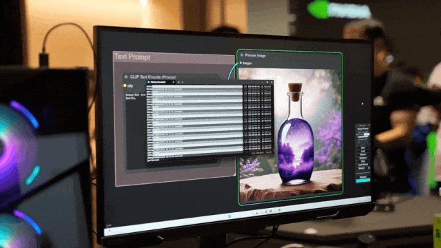 当然,光是高水准的出图还不够,为了提升效率,现场还演示了市面上最快的 Stable Diffusion 计算出图方案——在 GeForce RTX 4090 D 桌面端 GPU 上开箱即可享受到高达每秒 8 张图的生成速度。什么概念?要知道笔者用自己两年前配的电脑跑 stable Diffusion 文生图的时候,平均几乎要 30 秒才能生成一张图,看到这我当场想换显卡。