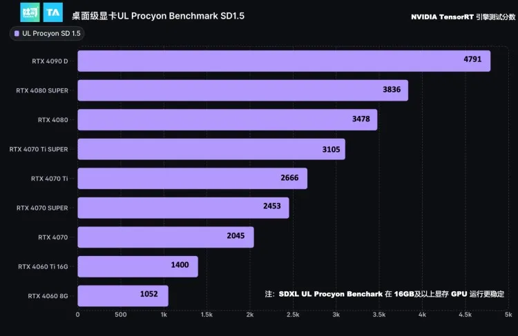在UL Benchmark SD1.5和SDXL下,RTX40系显卡的表现