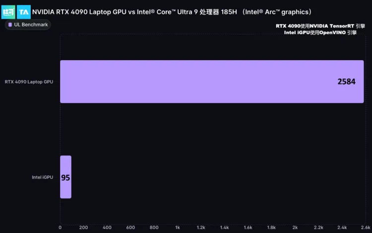 其中在 UL Benchmark SD1.5 TRT vs. OpenVINO 的对比测试中,RTX 4090 笔记本电脑 GPU 相对于 iGPU(Arc Graphics)有超过 27 倍的性能提升。