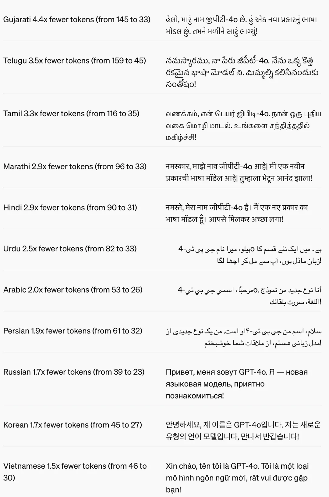 GPT-4o 还有超高的“语言天赋”,能支持 50 种语言,并显着提高了非英语语言的性能,包括改进分词器以更好地压缩其中的许多语言: