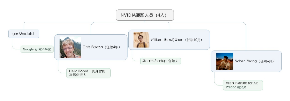 英伟达 44 名具身智能研究人员有 4 人离开,占比 9%。一人去了谷歌,一人去了 Allen Institute for AI 研究机构,另外两人选择创业。