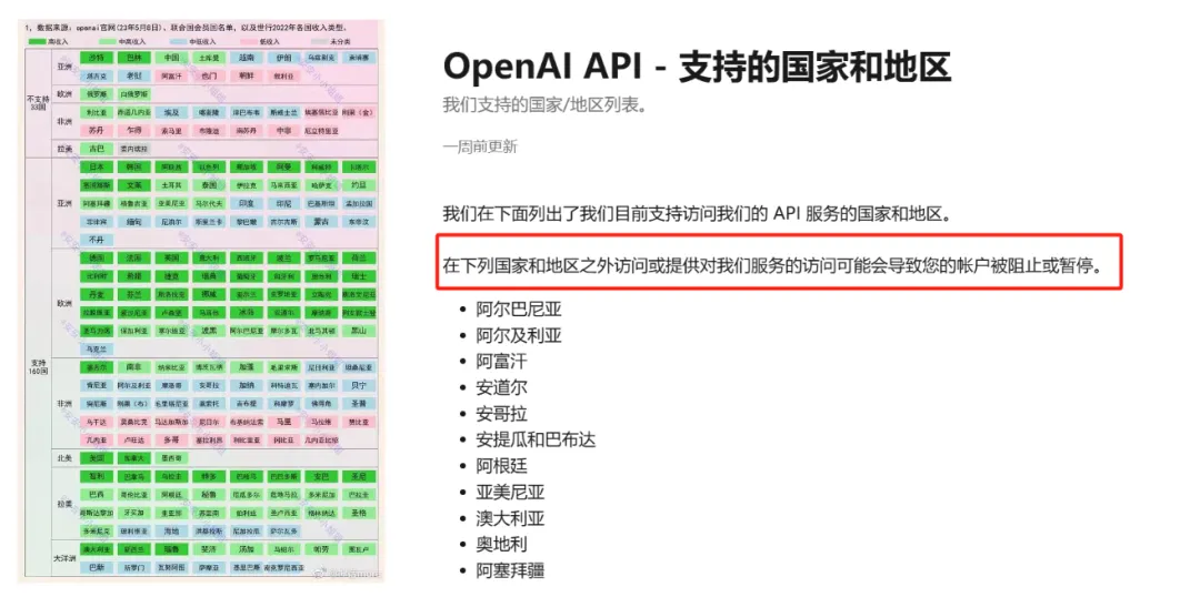 其实 OpenAI 很早就在官网上列举了哪些国家和地区不支持他们家的 API 服务,只不过对于用特殊方法获得 API 服务的用户,睁一只眼闭一只眼罢了。