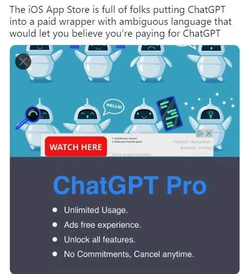 国内有不少创业公司通过接入 OpenAI API,简单设计个 UI 界面,冒充自己是 GPT AI 聊天机器人,从而收取会员费。这类公司的创业模式主打一个信息差,欺负不会科学上网又想体验 GPT 的用户。